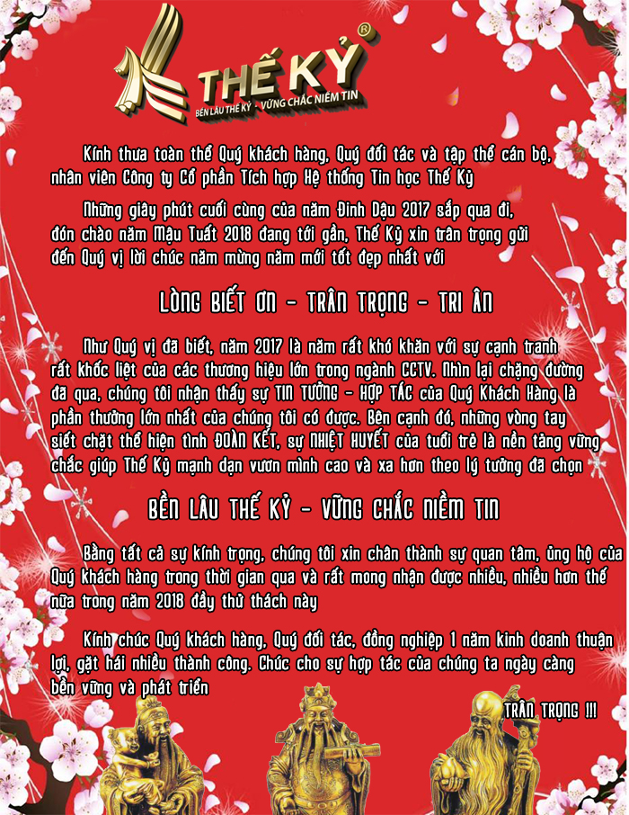 Nhân dịp này, chúng tôi cũng xin thông báo lịch nghỉ Tết Dương Lịch của Thế Kỷ bắt đầu từ Chủ Nhật ngày 31/12/2017 đến hết thứ 2 ngày 1/1/2018, bắt đầu từ thứ 3 ngày 2/1/2018, chúng tôi sẽ làm việc bình thường.