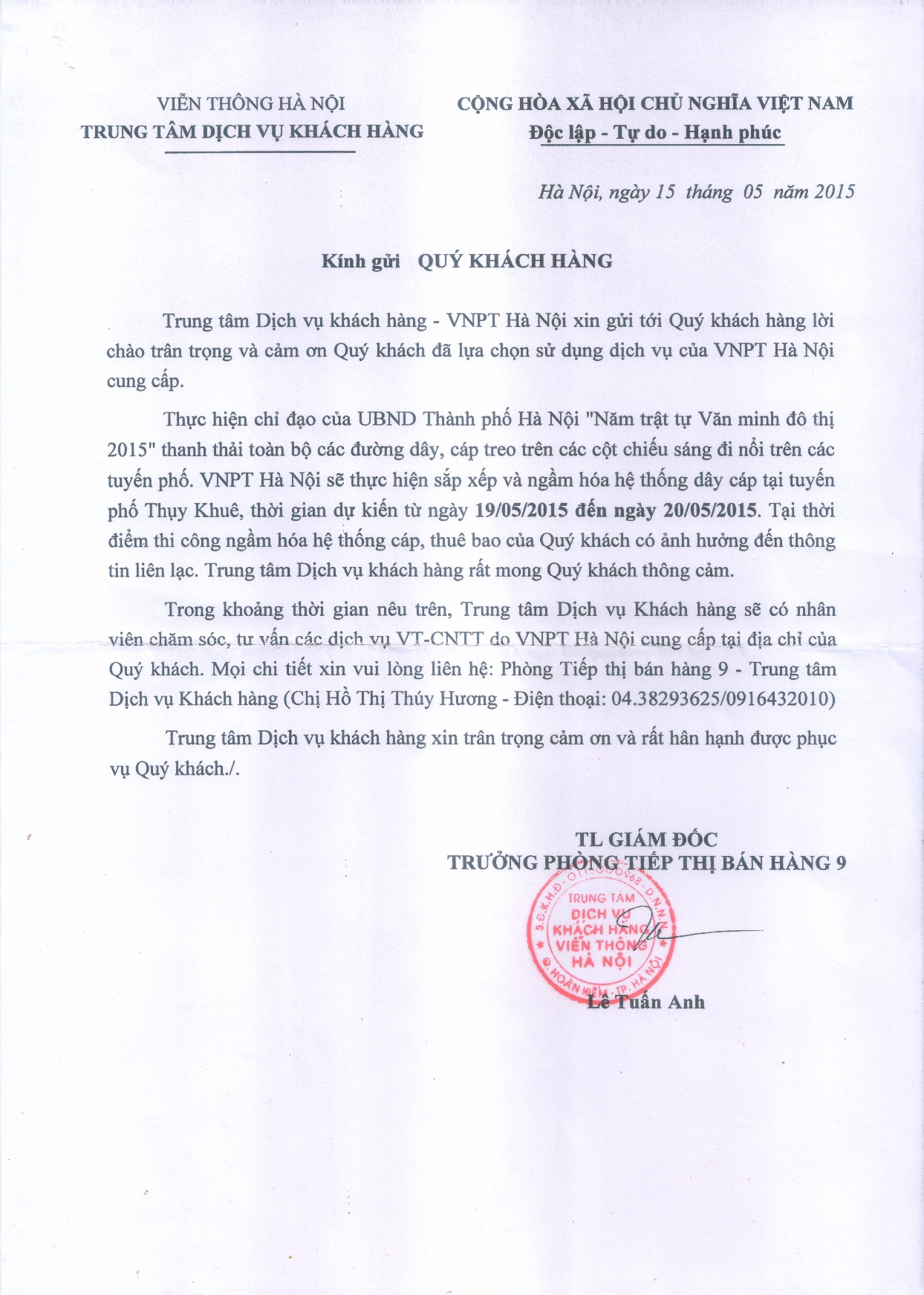 Để góp phần xây dựng thủ đô xanh, sạch, đẹp VNPT sẽ hạ ngầm tuyến cáp khu phố Thụy Khuê nên hệ thống Tổng đài công ty chúng tôi sẽ ngừng hoạt động trong 2 ngày 19 & 20/5. Trong thời gian trên, Quý Đối tác, Khách hàng vui lòng liên hệ với chúng tôi qua Email/ ĐTDĐ/ YM ... hoặc call trực tiếp số hotline:
